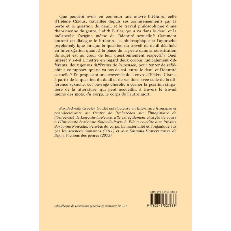 Que peuvent avoir en commun une oeuvre littéraire, celle d’Hélène Cixous, travaillée depuis ses commencements par la perte et la question du deuil, et le travail philosophique d’une théoricienne du genre, Judith Butler, qui a vu dans le deuil et la mélancolie l’origine même de l’identité sexuelle? Comment entrent en dialogue le littéraire, le philosophique et l’approche psychanalytique lorsque la question du travail de deuil déclinée en interrogation quant à la place de la perte dans la constitution du sujet est au coeur de leur questionnement respectif ? Quel intérêt y a-t-il à mettre en regard deux corpus radicalement différents, deux genres différents de la pensée, pour tenter de réfléchir à ce rapport, qui ne va pas de soi, entre le deuil et l’identité sexuelle ? En proposant une traversée de l’oeuvre d’Hélène Cixous à partir de la question du deuil et de ses liens avec celle de la différence sexuelle, cet ouvrage cherche à cerner la position singulière de la littérature, qui peut accueillir, à travers le travail même des mots, du corps, le corps de l’autre mort.