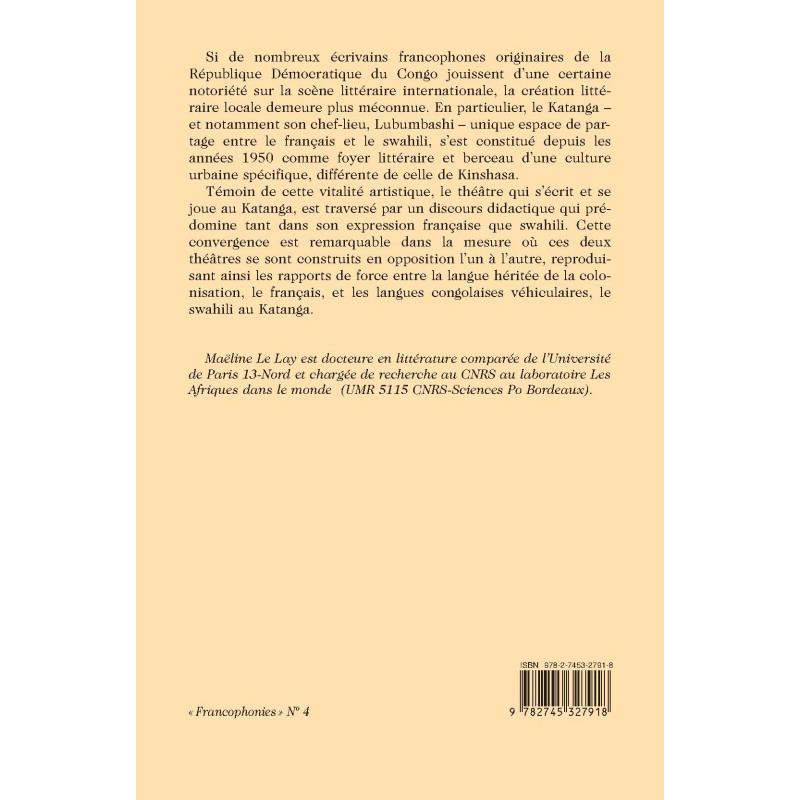 Si de nombreux écrivains francophones originaires de la République Démocratique du Congo jouissent d’une certaine notoriété sur la scène littéraire internationale, la création littéraire locale demeure plus méconnue. En particulier, le Katanga – et notamment son chef-lieu, Lubumbashi – unique espace de partage entre le français et le swahili, s’est constitué depuis les années 1950 comme foyer littéraire et berceau d’une culture urbaine spécifique, différente de celle de Kinshasa.