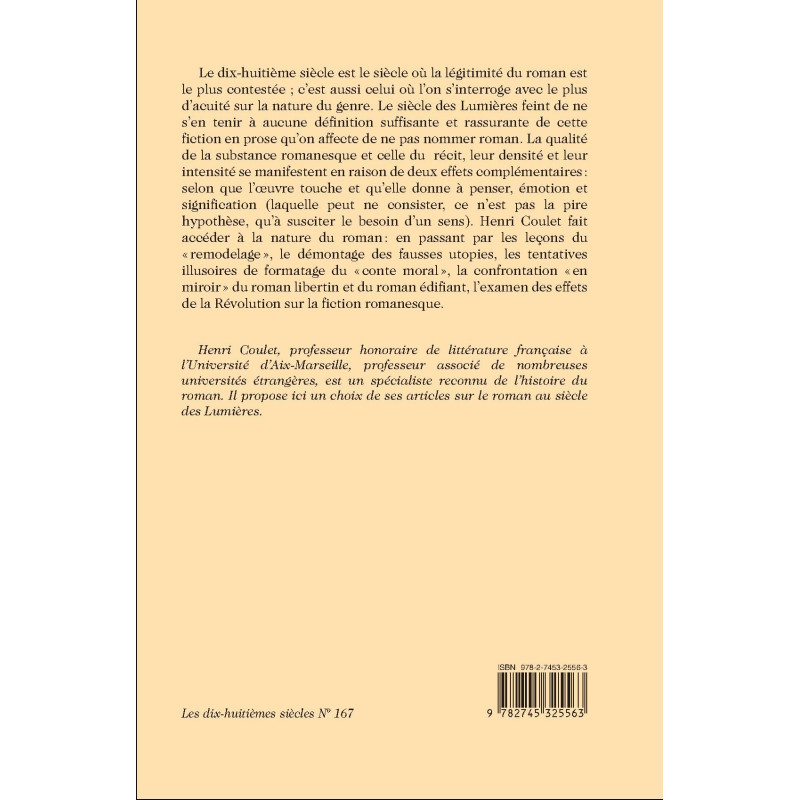 fiction en prose qu’on affecte de ne pas nommer roman. La qualité de la substance romanesque et celle du récit, leur densité et leur intensité se manifestent en raison de deux effets complémentaires: selon que l’oeuvre touche et qu’elle donne à penser, émotion et signification (laquelle peut ne consister, ce n’est pas la pire hypothèse, qu’à susciter le besoin d’un sens). Henri Coulet fait accéder à la nature du roman : en passant par les leçons du « remodelage », le démontage des fausses utopies, les tentatives illusoires de formatage du « conte moral », la confrontation « en miroir » du roman libertin et du roman édifiant, l’examen des effets de la Révolution sur la fiction romanesque.