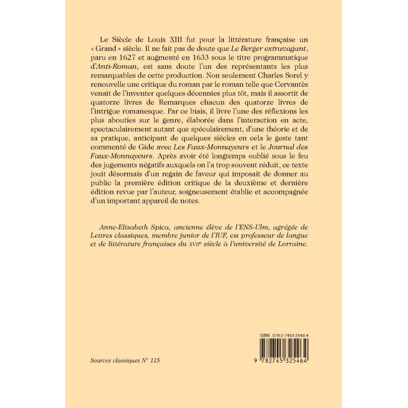 «Grand» siècle. Il ne fait pas de doute que Le Berger extravagant, paru en 1627 et augmenté en 1633 sous le titre programmatique d’Anti-Roman, est sans doute l’un des représentants les plus remarquables de cette production. Non seulement Charles Sorel y renouvelle une critique du roman par le roman telle que Cervantès venait de l’inventer quelques décennies plus tôt, mais il assortit de quatorze livres de Remarques chacun des quatorze livres de l’intrigue romanesque. Par ce biais, il livre l’une des réflexions les plus abouties sur le genre, élaborée dans l’interaction en acte, spectaculairement autant que spéculairement, d’une théorie et de sa pratique, anticipant de quelques siècles en cela le geste tant commenté de Gide avec Les Faux-Monnayeurs et le Journal des Faux-Monnayeurs. Après avoir été longtemps oublié sous le feu des jugements négatifs auxquels on l’a trop souvent réduit, ce texte