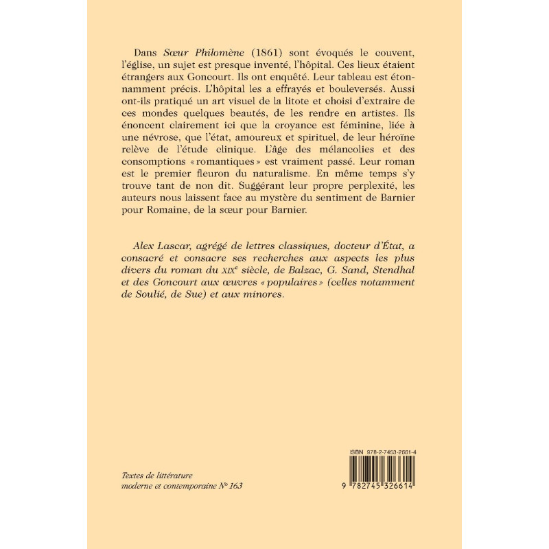 Alex Lascar, agrégé de lettres classiques, docteur d’État, a consacré et consacre ses recherches aux aspects les plus divers du roman du XIXe siècle, de Balzac, G. Sand, Stendhal et des Goncourt aux oeuvres «populaires » (celles notamment de Soulié, de Sue) et aux minores.