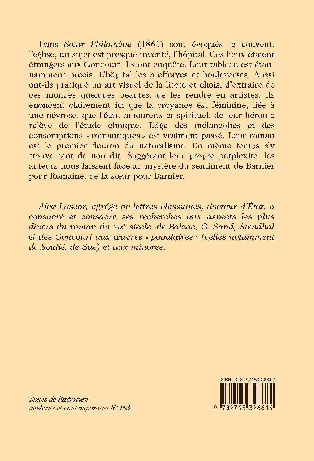Dans Soeur Philomène (1861) sont évoqués le couvent, l’église, un sujet est presque inventé, l’hôpital. Ces lieux étaient étrangers aux Goncourt. Ils ont enquêté. Leur tableau est étonnamment précis. L’hôpital les a effrayés et bouleversés. Aussi ont-ils pratiqué un art visuel de la litote et choisi d’extraire de ces mondes quelques beautés, de les rendre en artistes. Ils énoncent clairement ici que la croyance est féminine, liée à une névrose, que l’état, amoureux et spirituel, de leur héroïne relève de l’étude clinique. L’âge des mélancolies et des consomptions « romantiques » est vraiment passé. Leur roman est le premier fleuron du naturalisme. En même temps s’y trouve tant de non dit. Suggérant leur propre perplexité, les auteurs nous laissent face au mystère du sentiment de Barnier pour Romaine, de la soeur pour Barnier.