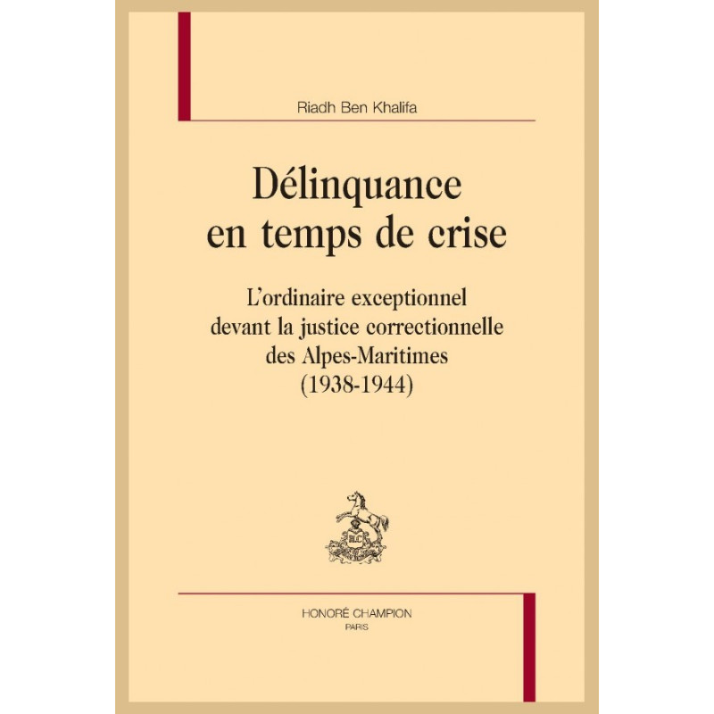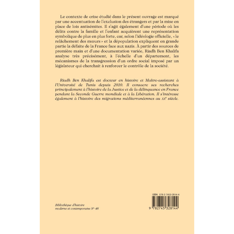 Le contexte de crise étudié dans le présent ouvrage est marqué par une accentuation de l’exclusion des étrangers et par la mise en place de lois antisémites. Il s’agit également d’une période où les délits contre la famille et l’enfant acquièrent une représentation symbolique de plus en plus forte, car, selon l’idéologie officielle, « le relâchement des moeurs » et la dépopulation expliquent en grande partie la défaite de la France face aux nazis. À partir des sources de première main et d’une documentation variée, Riadh Ben Khalifa analyse très précisément, à l’échelle d’un département, les mécanismes de la transgression d’un ordre social imposé par un législateur qui cherchait à renforcer le contrôle de la société.