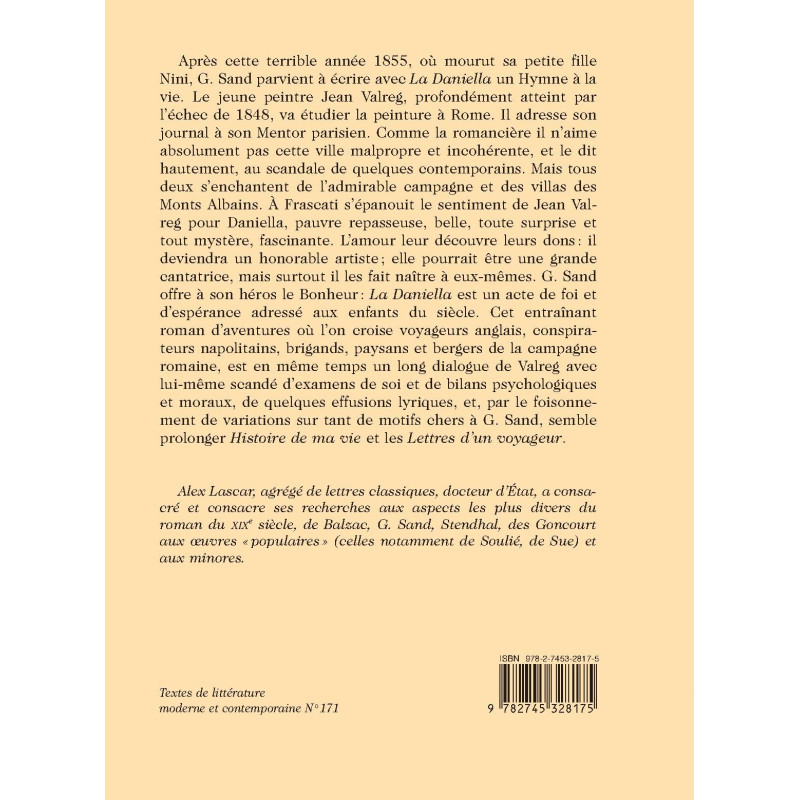 Après cette terrible année 1855, où mourut sa petite fille Nini, G. Sand parvient à écrire avec La Daniella un Hymne à la vie. Le jeune peintre Jean Valreg, profondément atteint par l’échec de 1848, va étudier la peinture à Rome. Il adresse son journal à son Mentor parisien. Comme la romancière il n’aime absolument pas cette ville malpropre et incohérente, et le dit hautement, au scandale de quelques contemporains. Mais tous deux s’enchantent de l’admirable campagne et des villas des Monts Albains. À Frascati s’épanouit le sentiment de Jean Valreg pour Daniella, pauvre repasseuse, belle, toute surprise et tout mystère, fascinante. L’amour leur découvre leurs dons : il deviendra un honorable artiste ; elle pourrait être une grande cantatrice, mais surtout il les fait naître à eux-mêmes. G. Sand offre à son héros le Bonheur : La Daniella est un acte de foi et d’espérance adressé aux enfants du siècle. Cet entraînant roman d’aventures où l’on croise voyageurs anglais, conspirateurs napolitains, brigands, paysans et bergers de la campagne romaine, est en même temps un long dialogue de Valreg avec lui-même scandé d’examens de soi et de bilans psychologiques et moraux, de quelques effusions lyriques, et, par le foisonnement de variations sur tant de motifs chers à G. Sand, semble prolonger Histoire de ma vie et les Lettres d’un voyageur.