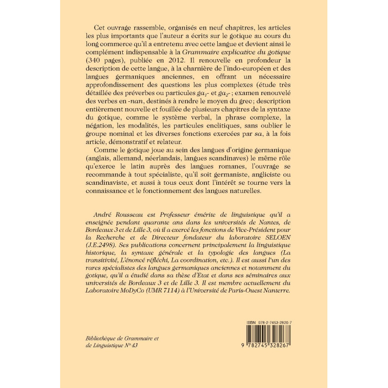 Cet ouvrage rassemble, organisés en neuf chapitres, les articles les plus importants que l’auteur a écrits sur le gotique au cours du long commerce qu’il a entretenu avec cette langue et devient ainsi le complément indispensable à la Grammaire explicative du gotique (340 pages), publiée en 2012. Il renouvelle en profondeur la description de cette langue, à la charnière de l’indo-européen et des langues germaniques anciennes, en offrant un nécessaire approfondissement des questions les plus complexes (étude très détaillée des préverbes ou particules ga1- et ga2-; examen renouvelé des verbes en -nan, destinés à rendre le moyen du grec ; description entièrement nouvelle et fouillée de plusieurs chapitres de la syntaxe du gotique, comme le système verbal, la phrase complexe, la négation, les modalités, les particules enclitiques, sans oublier le groupe nominal et les diverses fonctions exercées par sa, à la fois article, démonstratif et relateur. Comme le gotique joue au sein des langues d’origine germanique (anglais, allemand, néerlandais, langues scandinaves) le même rôle qu’exerce le latin auprès des langues romanes, l’ouvrage se recommande à tout spécialiste, qu’il soit germaniste, angliciste ou scandinaviste, et aussi à tous ceux dont l’intérêt se tourne vers la connaissance et le fonctionnement des langues naturelles.