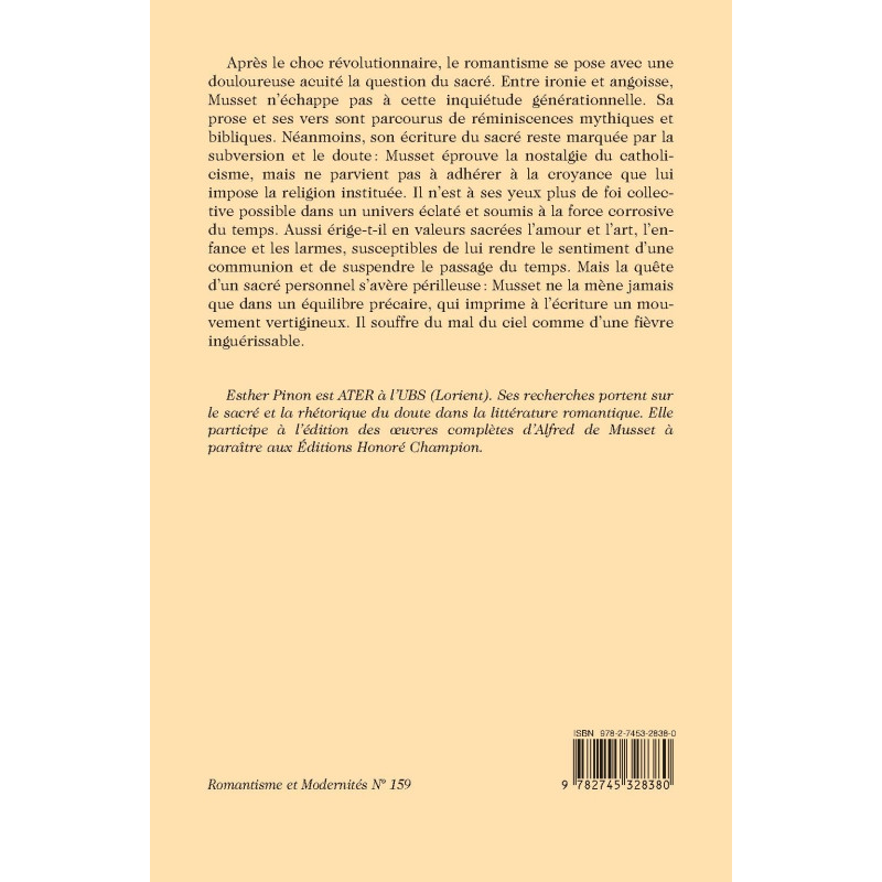 Esther Pinon est ATER à l’UBS (Lorient). Ses recherches portent sur le sacré et la rhétorique du doute dans la littérature romantique. Elle participe à l’édition des oeuvres complètes d’Alfred de Musset à paraître aux Éditions Honoré Champion.