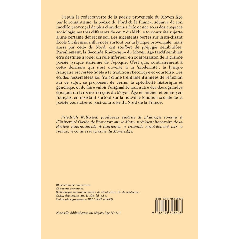 Depuis la redécouverte de la poésie provençale du Moyen Âge par le romantisme, la poésie du Nord de la France, séparée de son modèle provençal de plus d’un demi-siècle et née sous des auspices sociologiques très différents de ceux du Midi, a toujours été sujette à une certaine dépréciation. Les jugements portés sur la soi-disant École Sicilienne, influencés surtout par la lyrique provençale, mais aussi par celle du Nord, ont souffert de préjugés semblables. Pareillement, la Seconde Rhétorique du Moyen Âge tardif semblait être destinée à jouer un rôle inférieur en comparaison de la grande poésie lyrique italienne de l’époque. C’est que, contrairement à cette dernière qui s’est ouverte à la ‘modernité’, la lyrique française est restée fidèle à la tradition rhétorique et courtoise. Les études rassemblées ici, fruit d’une trentaine d’années de réflexion sur ce sujet, se proposent de cerner la spécificité historique et générique et de faire valoir l’originalité tout autre des deux grandes époques du lyrisme français du Moyen Âge en ancien et en moyen français, en insistant surtout sur la nouvelle fonction sociale de la poésie courtoise et post-courtoise du Nord de la France.