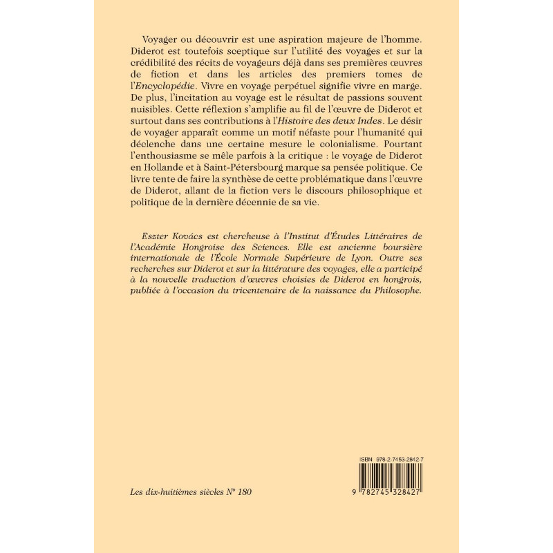 Voyager ou découvrir est une aspiration majeure de l’homme. Diderot est toutefois sceptique sur l’utilité des voyages et sur la crédibilité des récits de voyageurs déjà dans ses premières oeuvres de fiction et dans les articles des premiers tomes de l’Encyclopédie. Vivre en voyage perpétuel signifie vivre en marge. De plus, l’incitation au voyage est le résultat de passions souvent nuisibles. Cette réflexion s’amplifie au fil de l’oeuvre de Diderot et surtout dans ses contributions à l’Histoire des deux Indes. Le désir de voyager apparaît comme un motif néfaste pour l’humanité qui déclenche dans une certaine mesure le colonialisme. Pourtant l’enthousiasme se mêle parfois à la critique : le voyage de Diderot en Hollande et à Saint-Pétersbourg marque sa pensée politique. Ce livre tente de faire la synthèse de cette problématique dans l’oeuvre de Diderot, allant de la fiction vers le discours philosophique et politique de la dernière décennie de sa vie.