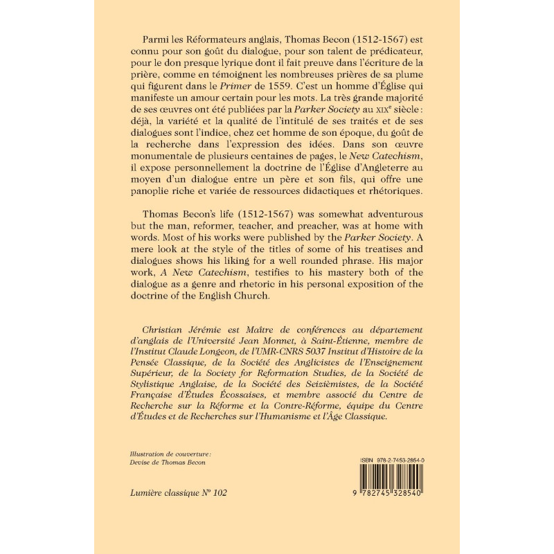 Christian Jérémie est Maître de conférences au département d’anglais de l’Université Jean Monnet, à Saint-Étienne, membre de l’Institut Claude Longeon, de l’UMR-CNRS 5037 Institut d’Histoire de la Pensée Classique, de la Société des Anglicistes de l’Enseignement Supérieur, de la Society for Reformation Studies, de la Société de Stylistique Anglaise, de la Société des Seizièmistes, de la Société Française d’Études Écossaises, et membre associé du Centre de Recherche sur la Réforme et la Contre-Réforme, équipe du Centre d’Études et de Recherches sur l’Humanisme et l’Âge Classique.