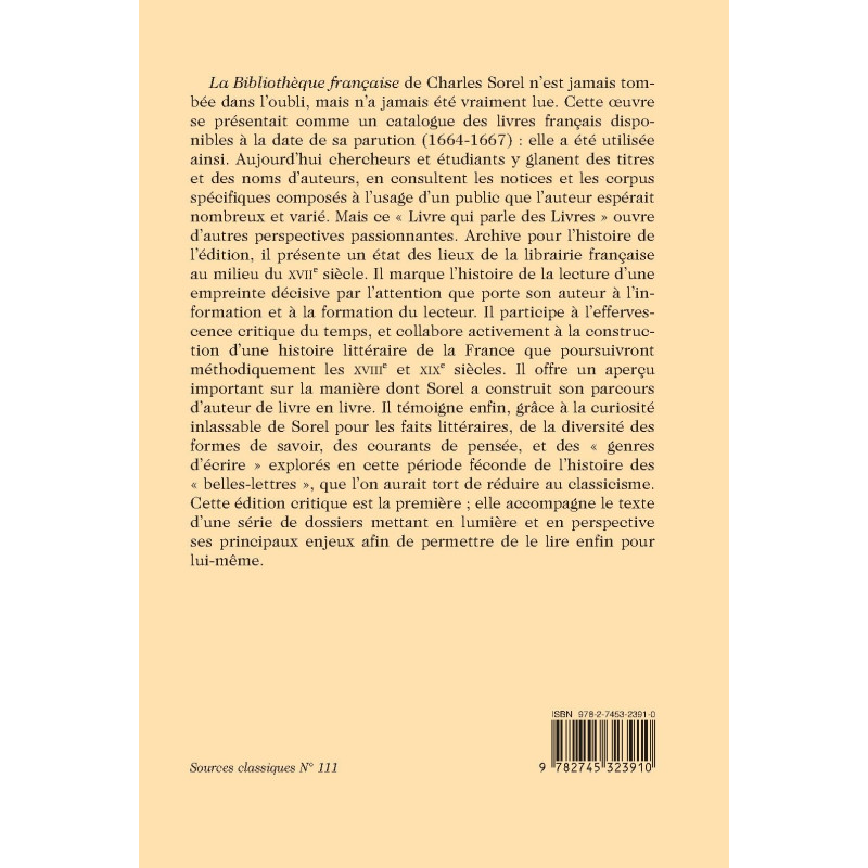 La Bibliothèque française de Charles Sorel n’est jamais tombée dans l’oubli, mais n’a jamais été vraiment lue. Cette oeuvre se présentait comme un catalogue des livres français disponibles à la date de sa parution (1664-1667) : elle a été utilisée ainsi. Aujourd’hui chercheurs et étudiants y glanent des titres et des noms d’auteurs, en consultent les notices et les corpus spécifiques composés à l’usage d’un public que l’auteur espérait nombreux et varié. Mais ce « Livre qui parle des Livres » ouvre d’autres perspectives passionnantes. Archive pour l’histoire de l’édition, il présente un état des lieux de la librairie française au milieu du XVIIe siècle. Il marque l’histoire de la lecture d’une empreinte décisive par l’attention que porte son auteur à l’information et à la formation du lecteur. Il participe à l’effervescence critique du temps, et collabore activement à la construction d’une histoire littéraire de la France que poursuivront méthodiquement les XVIIIe et XIXe siècles. Il offre un aperçu important sur la manière dont Sorel a construit son parcours d’auteur de livre en livre. Il témoigne enfin, grâce à la curiosité inlassable de Sorel pour les faits littéraires, de la diversité des formes de savoir, des courants de pensée, et des « genres d’écrire » explorés en cette période féconde de l’histoire des « belles-lettres », que l’on aurait tort de réduire au classicisme. Cette édition critique est la première ; elle accompagne le texte d’une série de dossiers mettant en lumière et en perspective ses principaux enjeux afin de permettre de le lire enfin pour lui-même.