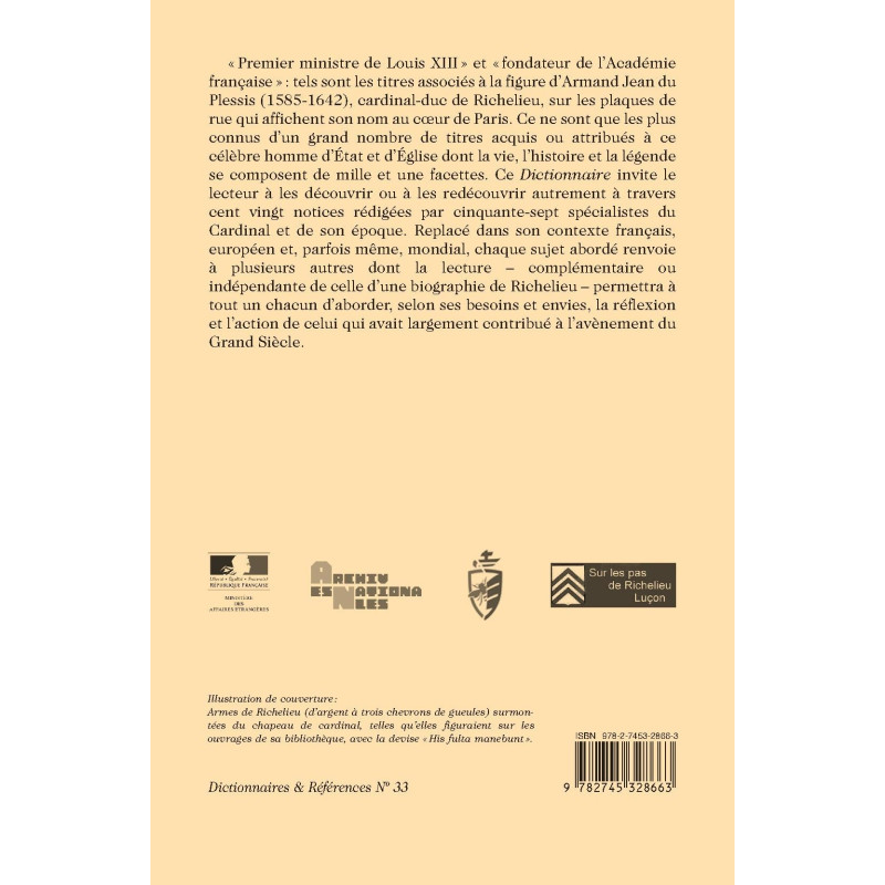«Premier ministre de Louis XIII » et « fondateur de l’Académie française » : tels sont les titres associés à la figure d’Armand Jean du Plessis (1585-1642), cardinal-duc de Richelieu, sur les plaques de rue qui affichent son nom au coeur de Paris. Ce ne sont que les plus connus d’un grand nombre de titres acquis ou attribués à ce célèbre homme d’État et d’Église dont la vie, l’histoire et la légende se composent de mille et une facettes. Ce Dictionnaire invite le lecteur à les découvrir ou à les redécouvrir autrement à travers cent vingt notices rédigées par cinquante-sept spécialistes du Cardinal et de son époque. Replacé dans son contexte français, européen et, parfois même, mondial, chaque sujet abordé renvoie à plusieurs autres dont la lecture – complémentaire ou indépendante de celle d’une biographie de Richelieu – permettra à tout un chacun d’aborder, selon ses besoins et envies, la réflexion et l’action de celui qui avait largement contribué à l’avènement du Grand Siècle.