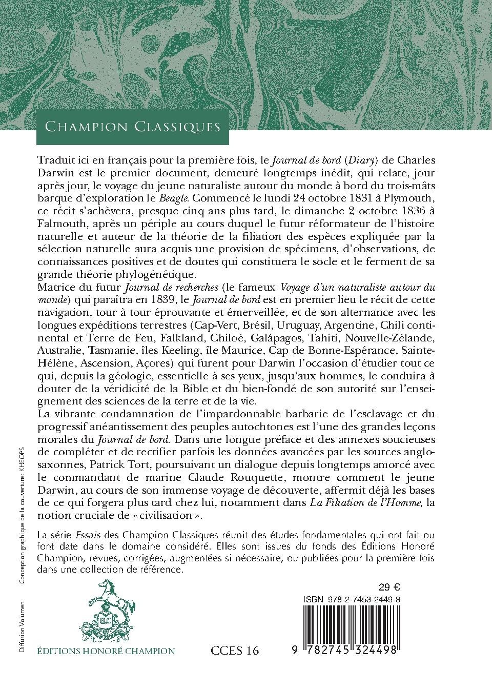 Traduit ici en français pour la première fois, le Journal de bord (Diary) de Charles Darwin est le premier document, demeuré longtemps inédit, qui relate, jour après jour, le voyage du jeune naturaliste autour du monde à bord du trois-mâts barque d’exploration le Beagle. Commencé le lundi 24 octobre 1831 à Plymouth, ce récit s’achèvera, presque cinq ans plus tard, le dimanche 2 octobre 1836 à Falmouth, après un périple au cours duquel le futur réformateur de l’histoire naturelle et auteur de la théorie de la filiation des espèces expliquée par la sélection naturelle aura acquis une provision de spécimens, d’observations, de connaissances positives et de doutes qui constituera le socle et le ferment de sa grande théorie phylogénétique. Matrice du futur Journal de recherches (le fameux Voyage d’un naturaliste autour du monde) qui paraîtra en 1839, le Journal de bord est en premier lieu le récit de cette navigation, tour à tour éprouvante et émerveillée, et de son alternance avec les longues expéditions terrestres (Cap-Vert, Brésil, Uruguay, Argentine, Chili continental et Terre de Feu, Falkland, Chiloé, Galápagos, Tahiti, Nouvelle-Zélande, Australie, Tasmanie, îles Keeling, île Maurice, Cap de Bonne-Espérance, Sainte- Hélène, Ascension, Açores) qui furent pour Darwin l’occasion d’étudier tout ce qui, depuis la géologie, essentielle à ses yeux, jusqu’aux hommes, le conduira à douter de la véridicité de la Bible et du bien-fondé de son autorité sur l’enseignement des sciences de la terre et de la vie. La vibrante condamnation de l’impardonnable barbarie de l’esclavage et du progressif anéantissement des peuples autochtones est l’une des grandes leçons morales du Journal de bord.