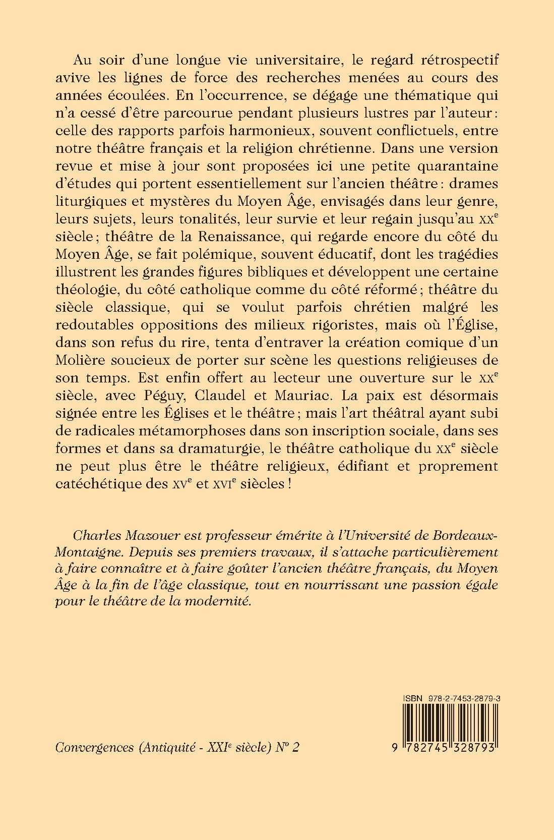 Au soir d’une longue vie universitaire, le regard rétrospectif avive les lignes de force des recherches menées au cours des années écoulées. En l’occurrence, se dégage une thématique qui n’a cessé d’être parcourue pendant plusieurs lustres par l’auteur : celle des rapports parfois harmonieux, souvent conflictuels, entre notre théâtre français et la religion chrétienne. Dans une version revue et mise à jour sont proposées ici une petite quarantaine d’études qui portent essentiellement sur l’ancien théâtre : drames liturgiques et mystères du Moyen Âge, envisagés dans leur genre, leurs sujets, leurs tonalités, leur survie et leur regain jusqu’au XXe siècle ; théâtre de la Renaissance, qui regarde encore du côté du Moyen Âge, se fait polémique, souvent éducatif, dont les tragédies illustrent les grandes figures bibliques et développent une certaine théologie, du côté catholique comme du côté réformé ; théâtre du siècle classique, qui se voulut parfois chrétien malgré les redoutables oppositions des milieux rigoristes, mais où l’Église, dans son refus du rire, tenta d’entraver la création comique d’un Molière soucieux de porter sur scène les questions religieuses de son temps. Est enfin offert au lecteur une ouverture sur le XXe siècle, avec Péguy, Claudel et Mauriac. La paix est désormais signée entre les Églises et le théâtre ; mais l’art théâtral ayant subi de radicales métamorphoses dans son inscription sociale, dans ses formes et dans sa dramaturgie, le théâtre catholique du XXe siècle ne peut plus être le théâtre religieux, édifiant et proprement catéchétique des XVe et XVIe siècles !