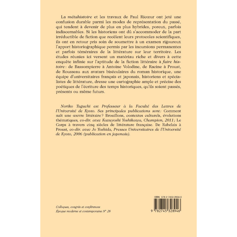 part irréductible de fiction que recèlent leurs protocoles scientifiques, ils ont en retour pris soin de soumettre à un examen rigoureux l’apport historiographique permis par les incursions permanentes et parfois téméraires de la littérature sur leur territoire. Les études réunies ici versent un matériau riche et divers à cette enquête infinie sur l’aptitude de la fiction littéraire à faire histoire: de Bassompierre à Antoine Volodine, de Racine à Proust, de Rousseau aux avatars biséculaires du roman historique, une équipe d’universitaires français et japonais, historiens et spécialistes de littérature, dresse une cartographie ample et précise des poétiques de l’écriture des temps historiques, qu’ils soient passés, présents ou même futurs.