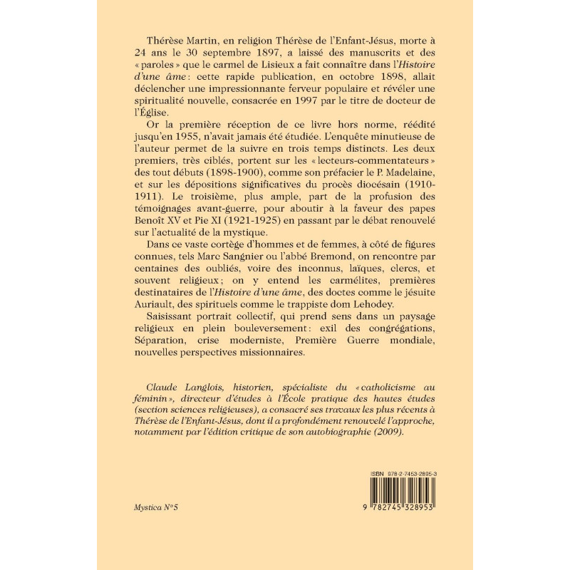 Thérèse Martin, en religion Thérèse de l’Enfant-Jésus, morte à 24 ans le 30 septembre 1897, a laissé des manuscrits et des « paroles » que le carmel de Lisieux a fait connaître dans l’Histoire d’une âme: cette rapide publication, en octobre 1898, allait déclencher une impressionnante ferveur populaire et révéler une spiritualité nouvelle, consacrée en 1997 par le titre de docteur de l’Église. Or la première réception de ce livre hors norme, réédité jusqu’en 1955, n’avait jamais été étudiée. L’enquête minutieuse de l’auteur permet de la suivre en trois temps distincts. Les deux premiers, très ciblés, portent sur les « lecteurs-commentateurs » des tout débuts (1898-1900), comme son préfacier le P. Madelaine, et sur les dépositions significatives du procès diocésain (1910-1911). Le troisième, plus ample, part de la profusion des témoignages avant-guerre, pour aboutir à la faveur des papes Benoît XV et Pie XI (1921-1925) en passant par le débat renouvelé sur l’actualité de la mystique. Dans ce vaste cortège d’hommes et de femmes, à côté de figures connues, tels Marc Sangnier ou l’abbé Bremond, on rencontre par centaines des oubliés, voire des inconnus, laïques, clercs, et souvent religieux ; on y entend les carmélites, premières destinataires de l’Histoire d’une âme, des doctes comme le jésuite Auriault, des spirituels comme le trappiste dom Lehodey. Saisissant portrait collectif, qui prend sens dans un paysage religieux en plein bouleversement : exil des congrégations, Séparation, crise moderniste, Première Guerre mondiale, nouvelles perspectives missionnaires.