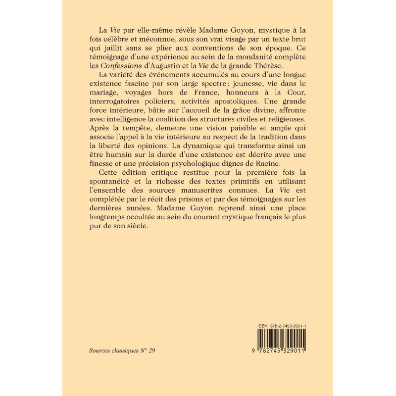 Cette édition critique restitue pour la première fois la spontanéité et la richesse des textes primitifs en utilisant l’ensemble des sources manuscrites connues. La Vie est complétée par le récit des prisons et par des témoignages sur les dernières années. Madame Guyon reprend ainsi une place longtemps occultée au sein du courant mystique français le plus pur de son siècle.