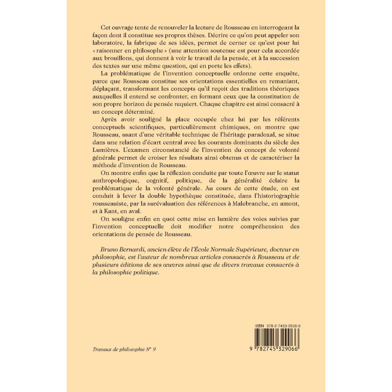 Cet ouvrage renouvelle la lecture de Rousseau par une approche génétique et cherche ainsi à cerner ce qu'est pour lui "raisonner en philosophe". La problématique de l'invention conceptuelle ordonne l'enquête, parce que Rousseau constitue ses orientations essentielles en remaniant, déplaçant, transformant les concepts qu'il reçoit des traditions théoriques auxquelles il entend se confronter, en formant ceux que la constitution de son propre horizon de pensée requiert. La formation des concepts d'association, de corps politique, de gouvernement mixte, de souveraineté, de guerre et d'état de guerre, d'intérêt, est l'objet des deux premières parties. La troisième rend compte de l'invention du concept de volonté générale. Est enfin interrogé le statut de la généralité dans la pensée de Rousseau.
