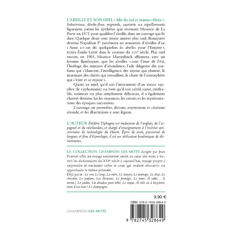 L’ABEILLE ET SON MIEL « fille du ciel et manne céleste ». Industrieuse, dérobe-fleur, mignarde, suçotante ou aiguillonnante figuraient parmi les épithètes que recensait Maurice de La Porte en 1571 pour qualifier l’abeille, dans un ouvrage qui fit date. Quelque deux cent trente années plus tard, Bonaparte devenu Napoléon Ier parsèmera ses armoiries d’abeilles d’or. « Ainsi a-t-on dit quelquefois les abeilles pour l’Empire », écrira Émile Littré dans le courant du XIXe siècle. Plus tard encore, en 1901, Maurice Maeterlinck affirmera, avec un lyrisme flamboyant, que les abeilles « sont l’âme de l’été, l’horloge des minutes d’abondance, l’aile diligente des parfums qui s’élancent, l’intelligence des rayons qui planent, le murmure des clartés qui tressaillent, le chant de l’atmosphère qui s’étire et se repose ». Quant au miel, qu’il soit l’instrument d’un atroce supplice (le cyphonisme) ou bien qu’il soit subtil, suave, profitable, rosineux ou plus simplement délicieux, il a également charrié derrière lui les croyances, les savoirs et les représentations des époques successives. L’ouvrage, en proverbes, dictons, expressions et citations abonde, et les illustrations y sont légion.