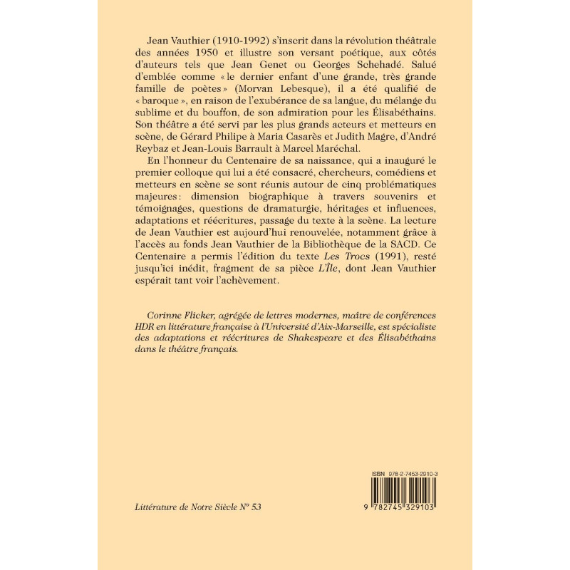 Jean Vauthier (1910-1992) s’inscrit dans la révolution théâtrale des années 1950 et illustre son versant poétique, aux côtés d’auteurs tels que Jean Genet ou Georges Schehadé. Salué d’emblée comme « le dernier enfant d’une grande, très grande famille de poètes » (Morvan Lebesque), il a été qualifié de «baroque », en raison de l’exubérance de sa langue, du mélange du sublime et du bouffon, de son admiration pour les Élisabéthains. Son théâtre a été servi par les plus grands acteurs et metteurs en scène, de Gérard Philipe à Maria Casarès et Judith Magre, d’André Reybaz et Jean-Louis Barrault à Marcel Maréchal. En l’honneur du Centenaire de sa naissance, qui a inauguré le premier colloque qui lui a été consacré, chercheurs, comédiens et metteurs en scène se sont réunis autour de cinq problématiques majeures : dimension biographique à travers souvenirs et témoignages, questions de dramaturgie, héritages et influences, adaptations et réécritures, passage du texte à la scène. La lecture de Jean Vauthier est aujourd’hui renouvelée, notamment grâce à l’accès au fonds Jean Vauthier de la Bibliothèque de la SACD. Ce Centenaire a permis l’édition du texte Les Trocs (1991), resté jusqu’ici inédit, fragment de sa pièce L’Île, dont Jean Vauthier espérait tant voir l’achèvement.