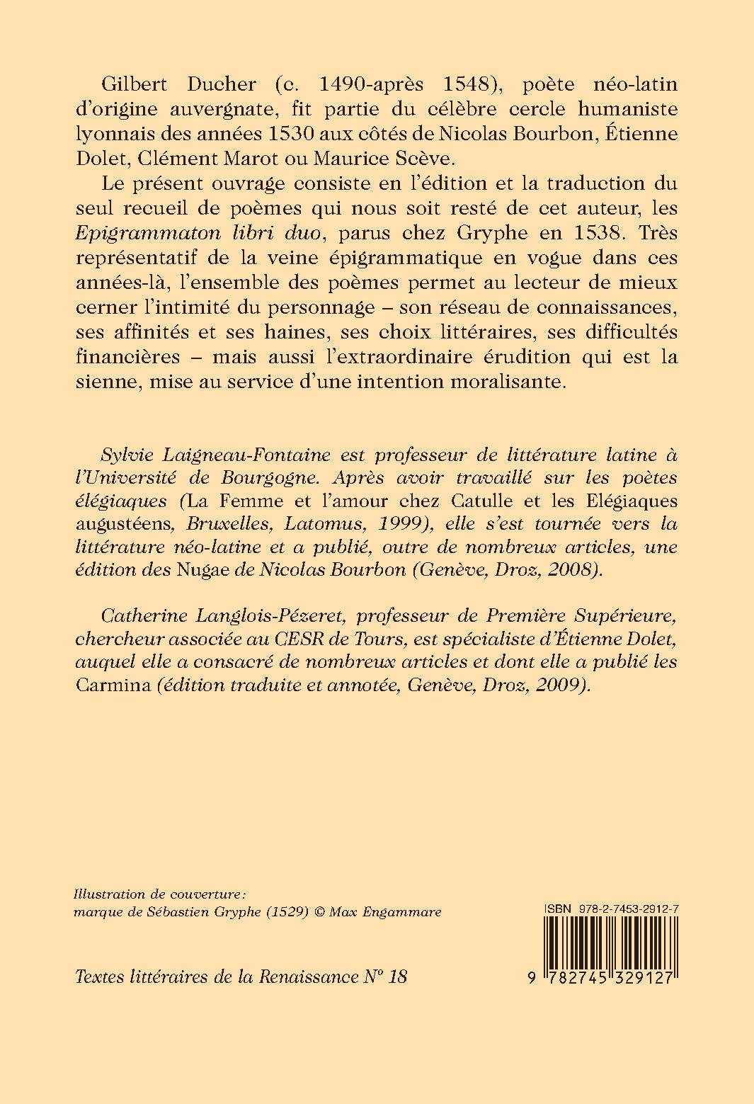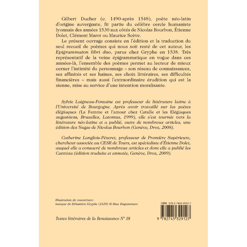 Sylvie Laigneau-Fontaine est professeur de littérature latine à l’Université de Bourgogne. Après avoir travaillé sur les poètes élégiaques (La Femme et l’amour chez Catulle et les Elégiaques augustéens, Bruxelles, Latomus, 1999), elle s’est tournée vers la littérature néo-latine et a publié, outre de nombreux articles, une édition des Nugae de Nicolas Bourbon (Genève, Droz, 2008).