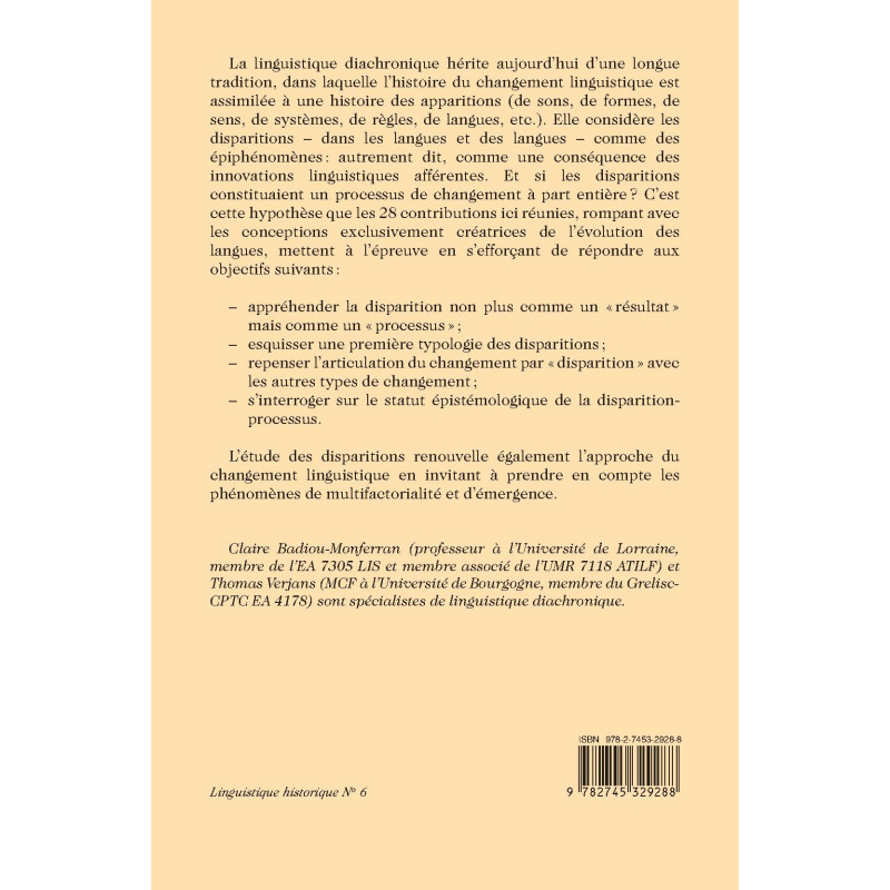 La linguistique diachronique hérite aujourd’hui d’une longue tradition, dans laquelle l’histoire du changement linguistique est assimilée à une histoire des apparitions (de sons, de formes, de sens, de systèmes, de règles, de langues, etc.). Elle considère les disparitions – dans les langues et des langues – comme des épiphénomènes : autrement dit, comme une conséquence des innovations linguistiques afférentes. Et si les disparitions constituaient un processus de changement à part entière? C’est cette hypothèse que les 28 contributions ici réunies, rompant avec les conceptions exclusivement créatrices de l’évolution des langues, mettent à l’épreuve en s’efforçant de répondre aux objectifs suivants :