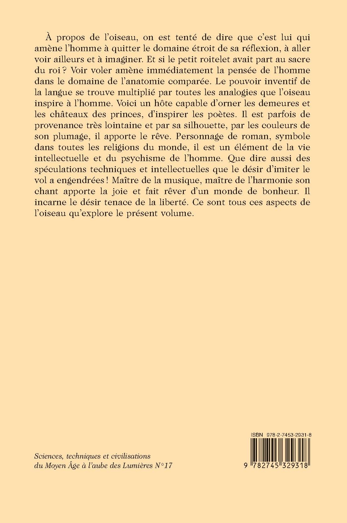 À propos de l’oiseau, on est tenté de dire que c’est lui qui amène l’homme à quitter le domaine étroit de sa réflexion, à aller voir ailleurs et à imaginer. Et si le petit roitelet avait part au sacre du roi ? Voir voler amène immédiatement la pensée de l’homme dans le domaine de l’anatomie comparée. Le pouvoir inventif de la langue se trouve multiplié par toutes les analogies que l’oiseau inspire à l’homme. Voici un hôte capable d’orner les demeures et les châteaux des princes, d’inspirer les poètes. Il est parfois de provenance très lointaine et par sa silhouette, par les couleurs de son plumage, il apporte le rêve. Personnage de roman, symbole dans toutes les religions du monde, il est un élément de la vie intellectuelle et du psychisme de l’homme. Que dire aussi des spéculations techniques et intellectuelles que le désir d’imiter le vol a engendrées ! Maître de la musique, maître de l’harmonie son chant apporte la joie et fait rêver d’un monde de bonheur. Il incarne le désir tenace de la liberté. Ce sont tous ces aspects de l’oiseau qu’explore le présent volume.