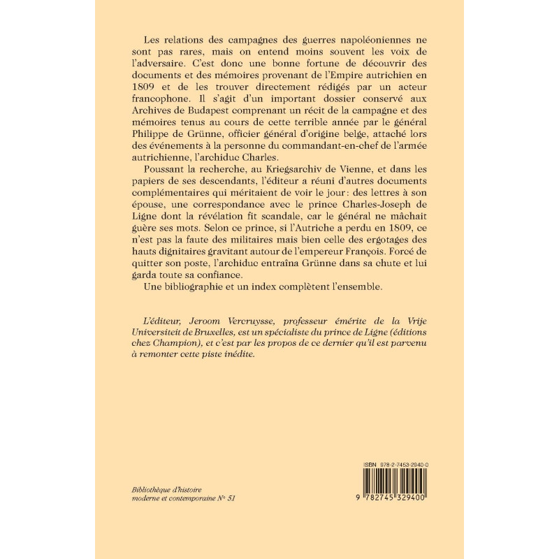 Les relations des campagnes des guerres napoléoniennes ne sont pas rares, mais on entend moins souvent les voix de l’adversaire. C’est donc une bonne fortune de découvrir des documents et des mémoires provenant de l’Empire autrichien en 1809 et de les trouver directement rédigés par un acteur francophone. Il s’agit d’un important dossier conservé aux Archives de Budapest comprenant un récit de la campagne et des mémoires tenus au cours de cette terrible année par le général Philippe de Grünne, officier général d’origine belge, attaché lors des événements à la personne du commandant-en-chef de l’armée autrichienne, l’archiduc Charles. Poussant la recherche, au Kriegsarchiv de Vienne, et dans les papiers de ses descendants, l’éditeur a réuni d’autres documents complémentaires qui méritaient de voir le jour : des lettres à son épouse, une correspondance avec le prince Charles-Joseph de Ligne dont la révélation fit scandale, car le général ne mâchait guère ses mots. Selon ce prince, si l’Autriche a perdu en 1809, ce n’est pas la faute des militaires mais bien celle des ergotages des hauts dignitaires gravitant autour de l’empereur François. Forcé de quitter son poste, l’archiduc entraîna Grünne dans sa chute et lui garda toute sa confiance. Une bibliographie et un index complètent l’ensemble.