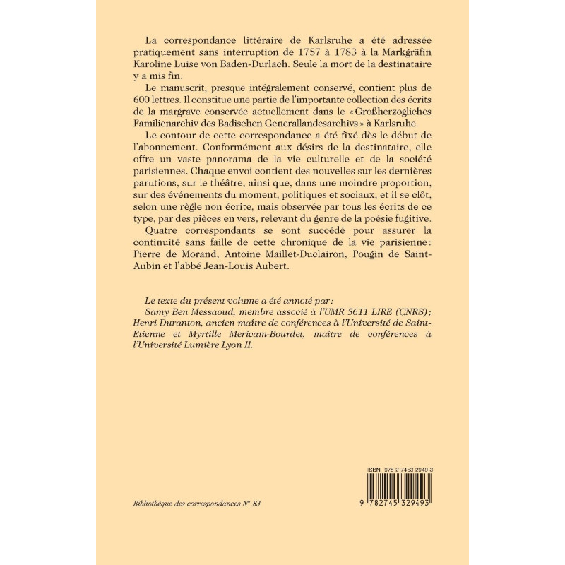 La correspondance littéraire de Karlsruhe a été adressée pratiquement sans interruption de 1757 à 1783 à la Markgräfin Karoline Luise von Baden-Durlach. Seule la mort de la destinataire y a mis fin.