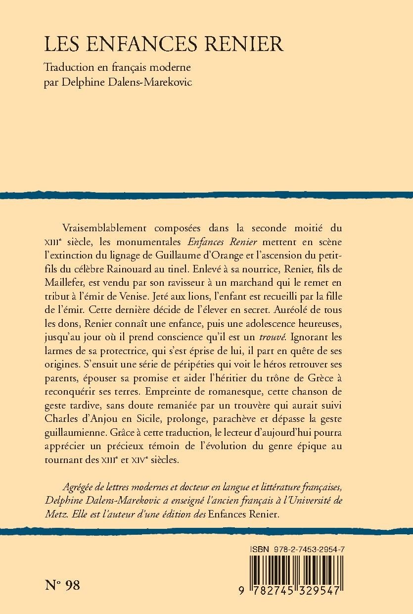 Vraisemblablement composées dans la seconde moitié du XIIIe siècle, les monumentales Enfances Renier mettent en scène l’extinction du lignage de Guillaume d’Orange et l’ascension du petit-fils du célèbre Rainouard au tinel. Enlevé à sa nourrice, Renier, fils de Maillefer, est vendu par son ravisseur à un marchand qui le remet en tribut à l’émir de Venise. Jeté aux lions, l’enfant est recueilli par la fille de l’émir. Cette dernière décide de l’élever en secret. Auréolé de tous les dons, Renier connaît une enfance, puis une adolescence heureuses, jusqu’au jour où il prend conscience qu’il est un trouvé. Ignorant les larmes de sa protectrice, qui s’est éprise de lui, il part en quête de ses origines. S’ensuit une série de péripéties qui voit le héros retrouver ses parents, épouser sa promise et aider l’héritier du trône de Grèce à reconquérir ses terres. Empreinte de romanesque, cette chanson de geste tardive, sans doute remaniée par un trouvère qui aurait suivi Charles d’Anjou en Sicile, prolonge, parachève et dépasse la geste guillaumienne. Grâce à cette traduction, le lecteur d’aujourd’hui pourra apprécier un précieux témoin de l’évolution du genre épique au tournant des XIIIe et XIVe siècles.