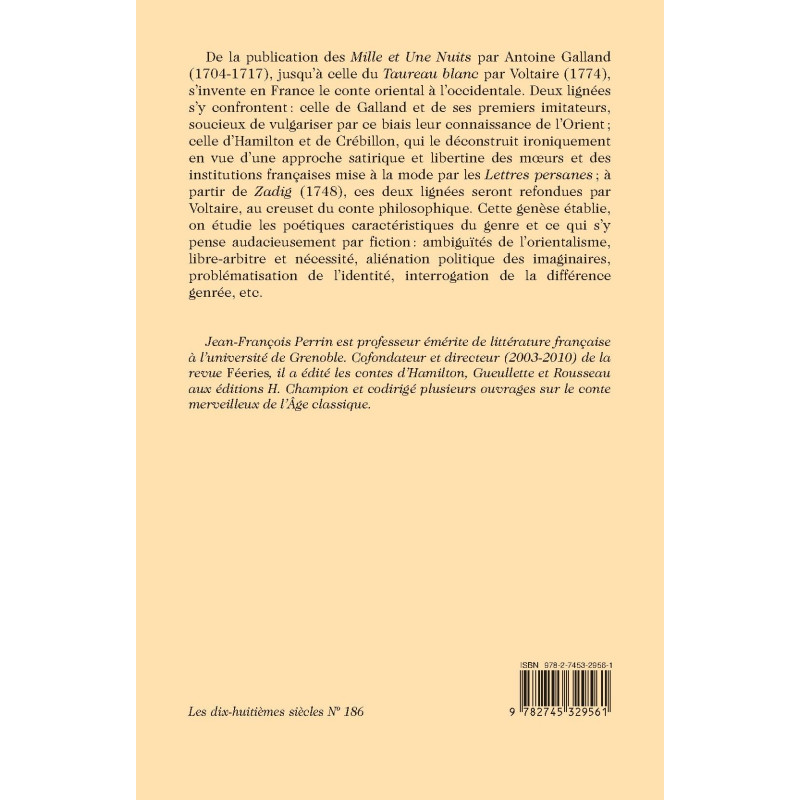De la publication des Mille et Une Nuits par Antoine Galland (1704-1717), jusqu’à celle du Taureau blanc par Voltaire (1774), s’invente en France le conte oriental à l’occidentale. Deux lignées s’y confrontent : celle de Galland et de ses premiers imitateurs, soucieux de vulgariser par ce biais leur connaissance de l’Orient ; celle d’Hamilton et de Crébillon, qui le déconstruit ironiquement en vue d’une approche satirique et libertine des mœurs et des institutions françaises mise à la mode par les Lettres persanes ; à partir de Zadig (1748), ces deux lignées seront refondues par Voltaire, au creuset du conte philosophique. Cette genèse établie, on étudie les poétiques caractéristiques du genre et ce qui s’y pense audacieusement par fiction : ambiguïtés de l’orientalisme, libre-arbitre et nécessité, aliénation politique des imaginaires, problématisation de l’identité, interrogation de la différence genrée, etc.