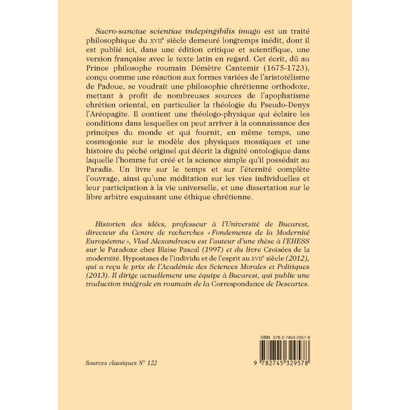 Sacro-sanctae scientiae indepingibilis imago est un traité philosophique du XVIIe siècle demeuré longtemps inédit, dont il est publié ici, dans une édition critique et scientifique, une version française avec le texte latin en regard. Cet écrit, dû au Prince philosophe roumain Démètre Cantemir (1675-1723), conçu comme une réaction aux formes variées de l’aristotélisme de Padoue, se voudrait une philosophie chrétienne orthodoxe, mettant à profit de nombreuses sources de l’apophatisme chrétien oriental, en particulier la théologie du Pseudo-Denys l’Aréopagite. Il contient une théologo-physique qui éclaire les conditions dans lesquelles on peut arriver à la connaissance des principes du monde et qui fournit, en même temps, une cosmogonie sur le modèle des physiques mosaïques et une histoire du péché originel qui décrit la dignité ontologique dans laquelle l’homme fut créé et la science simple qu’il possédait au Paradis. Un livre sur le temps et sur l’éternité complète l’ouvrage, ainsi qu’une méditation sur les vies individuelles et leur participation à la vie universelle, et une dissertation sur le libre arbitre esquissant une éthique chrétienne.
