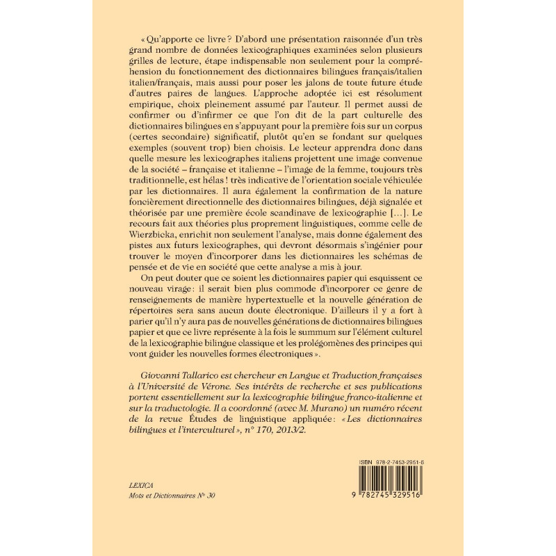 « Qu’apporte ce livre ? D’abord une présentation raisonnée d’un très grand nombre de données lexicographiques examinées selon plusieurs grilles de lecture, étape indispensable non seulement pour la compréhension du fonctionnement des dictionnaires bilingues français/italien italien/français, mais aussi pour poser les jalons de toute future étude d’autres paires de langues. L’approche adoptée ici est résolument empirique, choix pleinement assumé par l’auteur. Il permet aussi de confirmer ou d’infirmer ce que l’on dit de la part culturelle des dictionnaires bilingues en s’appuyant pour la première fois sur un corpus (certes secondaire) significatif, plutôt qu’en se fondant sur quelques exemples (souvent trop) bien choisis. Le lecteur apprendra donc dans quelle mesure les lexicographes italiens projettent une image convenue de la société – française et italienne – l’image de la femme, toujours très traditionnelle, est hélas ! très indicative de l’orientation sociale véhiculée par les dictionnaires. Il aura également la confirmation de la nature foncièrement directionnelle des dictionnaires bilingues, déjà signalée et théorisée par une première école scandinave de lexicographie […]. Le recours fait aux théories plus proprement linguistiques, comme celle de Wierzbicka, enrichit non seulement l’analyse, mais donne également des pistes aux futurs lexicographes, qui devront désormais s’ingénier pour trouver le moyen d’incorporer dans les dictionnaires les schémas de pensée et de vie en société que cette analyse a mis à jour.