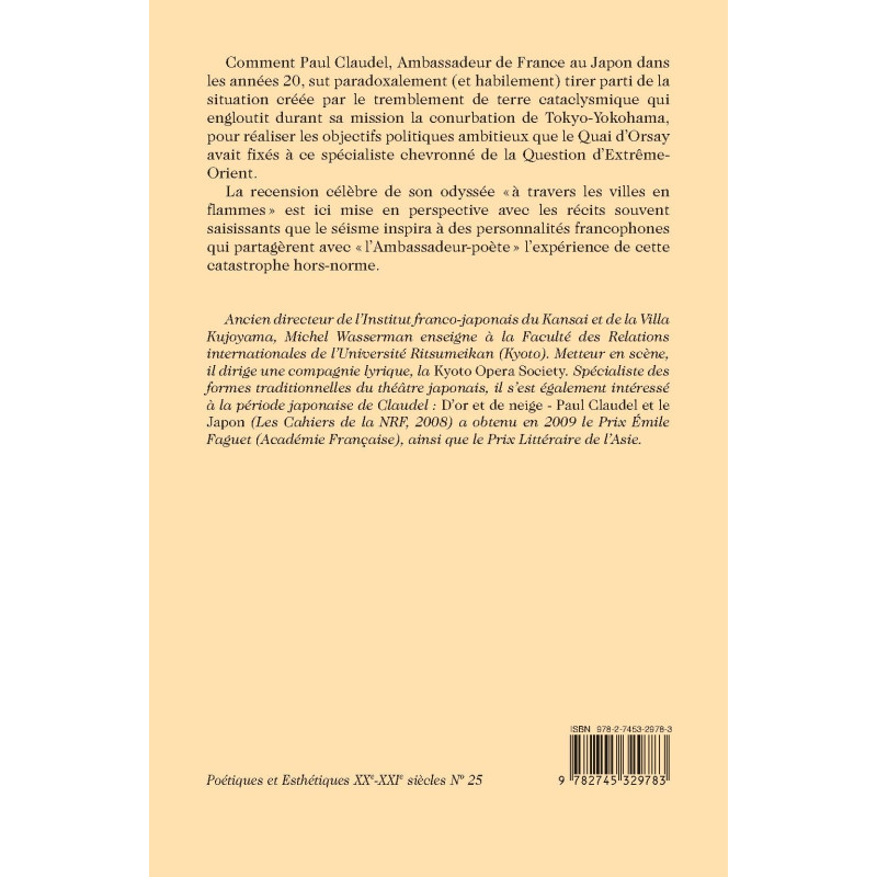 Comment Paul Claudel, Ambassadeur de France au Japon dans les années 20, sut paradoxalement (et habilement) tirer parti de la situation créée par le tremblement de terre cataclysmique qui engloutit durant sa mission la conurbation de Tokyo-Yokohama, pour réaliser les objectifs politiques ambitieux que le Quai d’Orsay avait fixés à ce spécialiste chevronné de la Question d’Extrême-Orient. La recension célèbre de son odyssée « à travers les villes en flammes » est ici mise en perspective avec les récits souvent saisissants que le séisme inspira à des personnalités francophones qui partagèrent avec « l’Ambassadeur-poète » l’expérience de cette catastrophe hors-norme.