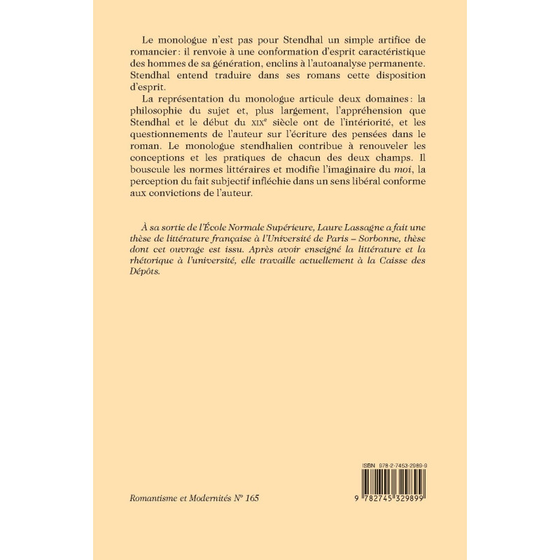 Le monologue n’est pas pour Stendhal un simple artifice de romancier : il renvoie à une conformation d’esprit caractéristique des hommes de sa génération, enclins à l’autoanalyse permanente. Stendhal entend traduire dans ses romans cette disposition d’esprit. La représentation du monologue articule deux domaines : la philosophie du sujet et, plus largement, l’appréhension que Stendhal et le début du XIXe siècle ont de l’intériorité, et les questionnements de l’auteur sur l’écriture des pensées dans le roman. Le monologue stendhalien contribue à renouveler les conceptions et les pratiques de chacun des deux champs. Il bouscule les normes littéraires et modifie l’imaginaire du moi, la perception du fait subjectif infléchie dans un sens libéral conforme aux convictions de l’auteur.