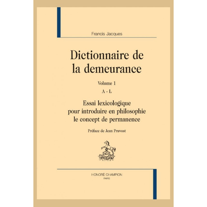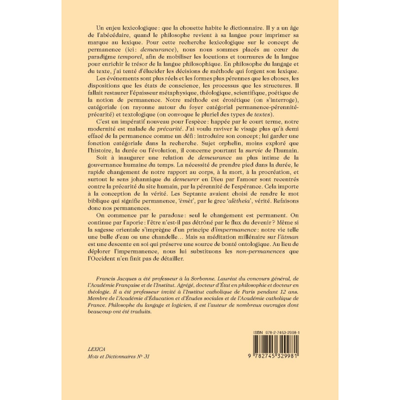 Un enjeu lexicologique : que la chouette habite le dictionnaire. Il y a un âge de l’abécédaire, quand le philosophe revient à sa langue pour imprimer sa marque au lexique. Pour cette recherche lexicologique sur le concept de permanence (ici : demeurance), nous nous sommes placés au cœur du paradigme temporel, afin de mobiliser les locutions et tournures de la langue pour enrichir le trésor de la langue philosophique. En philosophe du langage et du texte, j’ai tenté d’élucider les décisions de méthode qui forgent son lexique.