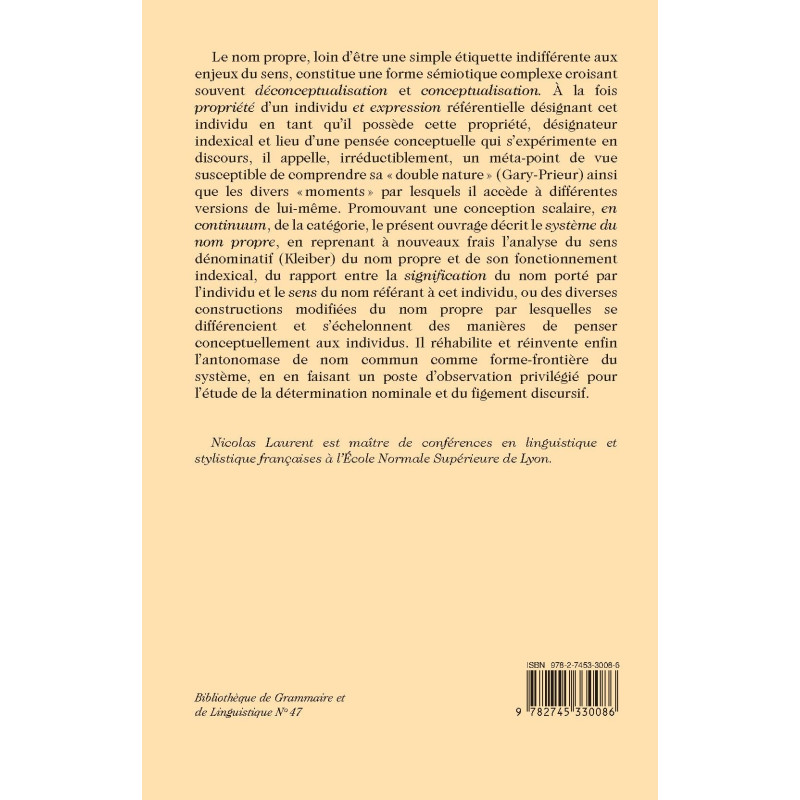 Le nom propre, loin d’être une simple étiquette indifférente aux enjeux du sens, constitue une forme sémiotique complexe croisant souvent déconceptualisation et conceptualisation. À la fois propriété d’un individu et expression référentielle désignant cet individu en tant qu’il possède cette propriété, désignateur indexical et lieu d’une pensée conceptuelle qui s’expérimente en discours, il appelle, irréductiblement, un méta-point de vue susceptible de comprendre sa « double nature » (Gary-Prieur) ainsi que les divers «moments» par lesquels il accède à différentes versions de lui-même. Promouvant une conception scalaire, en continuum, de la catégorie, le présent ouvrage décrit le système du nom propre, en reprenant à nouveaux frais l’analyse du sens dénominatif (Kleiber) du nom propre et de son fonctionnement indexical, du rapport entre la signification du nom porté par l’individu et le sens du nom référant à cet individu, ou des diverses constructions modifiées du nom propre par lesquelles se différencient et s’échelonnent des manières de penser conceptuellement aux individus. Il réhabilite et réinvente enfin l’antonomase de nom commun comme forme-frontière du système, en en faisant un poste d’observation privilégié pour l’étude de la détermination nominale et du figement discursif.