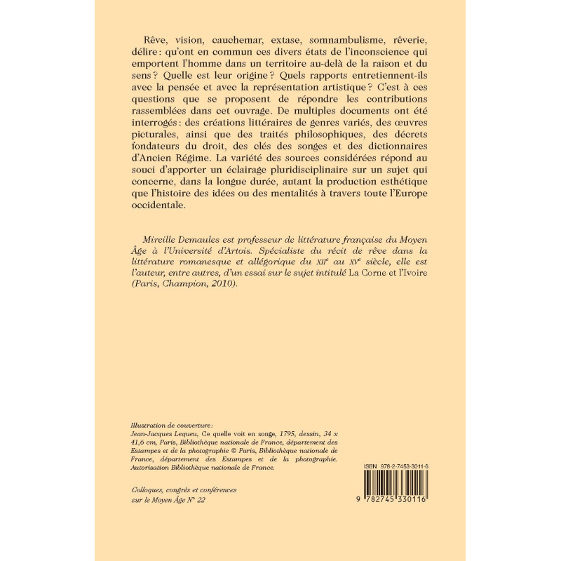 Rêve, vision, cauchemar, extase, somnambulisme, rêverie, délire : qu’ont en commun ces divers états de l’inconscience qui emportent l’homme dans un territoire au-delà de la raison et du sens ? Quelle est leur origine ? Quels rapports entretiennent-ils avec la pensée et avec la représentation artistique ? C’est à ces questions que se proposent de répondre les contributions rassemblées dans cet ouvrage. De multiples documents ont été interrogés : des créations littéraires de genres variés, des œuvres picturales, ainsi que des traités philosophiques, des décrets fondateurs du droit, des clés des songes et des dictionnaires d’Ancien Régime. La variété des sources considérées répond au souci d’apporter un éclairage pluridisciplinaire sur un sujet qui concerne, dans la longue durée, autant la production esthétique que l’histoire des idées ou des mentalités à travers toute l’Europe occidentale.