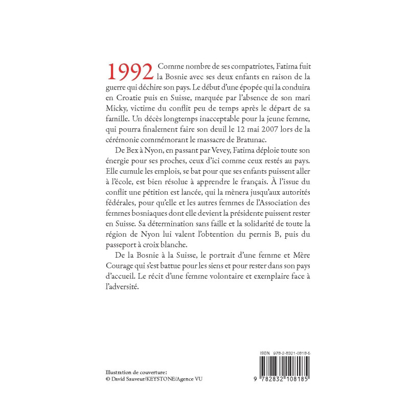 1992. Comme nombre de ses compatriotes, Fatima fuit la Bosnie avec ses deux enfants en raison de la guerre qui déchire son pays. Le début d’une épopée qui la conduira en Croatie puis en Suisse, marquée par l’absence de son mari Micky, victime du conflit peu de temps après le départ de sa famille. Un décès longtemps inacceptable pour la jeune femme, qui pourra finalement faire son deuil le 12 mai 2007 lors de la cérémonie commémorant le massacre de Bratunac.