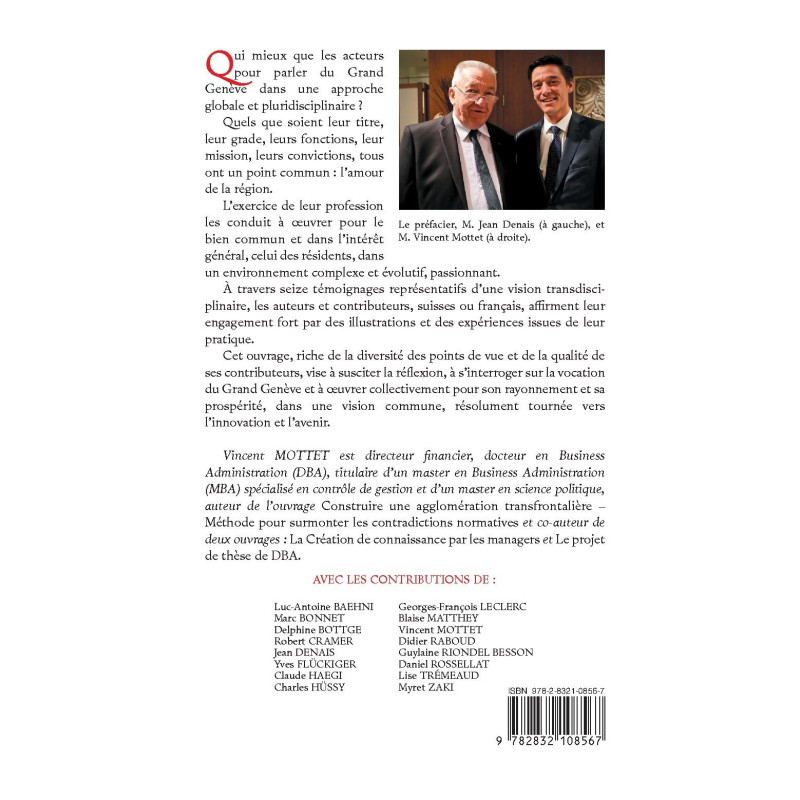 Cet ouvrage, riche de la diversité des points de vue et de la qualité de ses contributeurs, vise à susciter la réflexion, à s’interroger sur la vocation du Grand Genève et à œuvrer collectivement pour son rayonnement et sa prospérité, dans une vision commune, résolument tournée vers l’innovation et l’avenir.