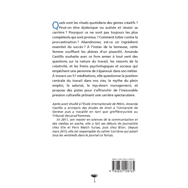 Peut-on être dyslexique ou autiste et réussir sa carrière? Pourquoi ce ne sont pas toujours les plus compétents qui sont promus ? Comment lutter contre la procrastination ? Abandonner, est-ce un ingrédient essentiel du succès ? À l’instar de la Semeuse, cette femme soufflant les akènes d’un pissenlit, Amanda Castillo souhaite avec ce livre semer à tout vent des questions sur la nature du travail, les ressorts de la créativité, et les freins psychologiques et sociaux qui empêchent une personne de s’épanouir dans son métier. À travers ces 57 méditations, elle questionne la position centrale du travail dans nos vies, le mythe du plein emploi, le salariat, le top-down management, et propose des pistes pour s’affranchir de l’inexorable pression culturelle prônant une carrière spectaculaire.