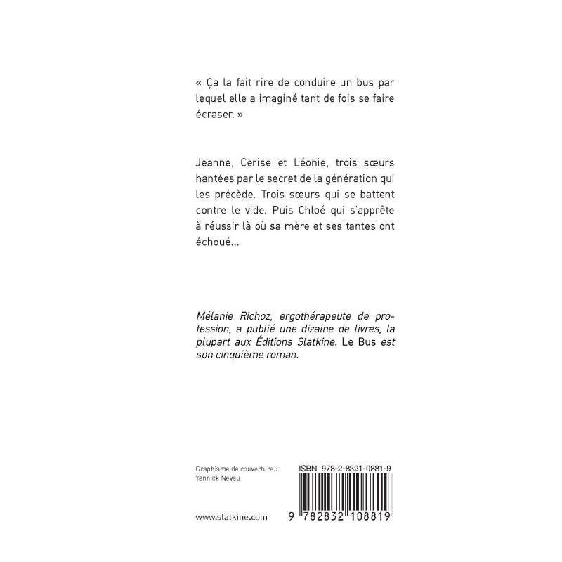 Mélanie Richoz, ergothérapeute de profession, a publié une dizaine de livres, la plupart aux Éditions Slatkine. Le Bus est son cinquième roman.