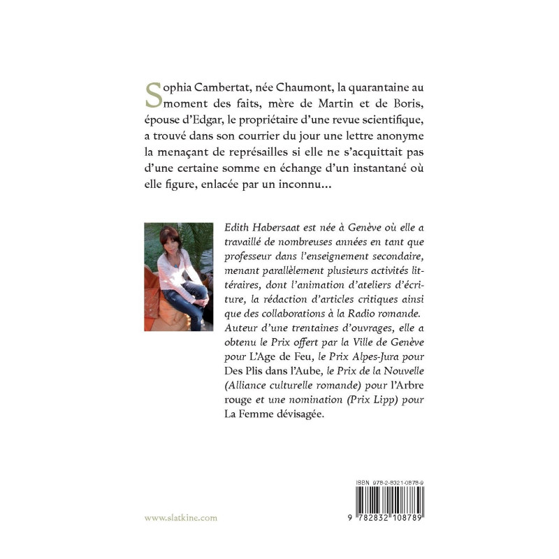Sophia Cambertat, née Chaumont, la quarantaine au moment des faits, mère de Martin et de Boris, épouse d’Edgar, le propriétaire d’une revue scientifique, a trouvé dans son courrier du jour une lettre anonyme la menaçant de représailles si elle ne s’acquittait pas d’une certaine somme en échange d’un instantané où elle figure, enlacée par un inconnu…