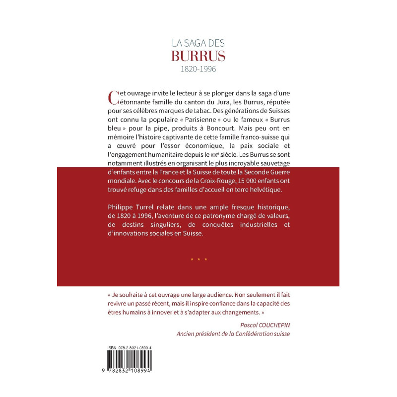 Cet ouvrage invite le lecteur à se plonger dans la saga d’une étonnante famille du canton du Jura, les Burrus, réputée pour ses célèbres marques de tabac. Des générations de Suisses ont connu la populaire « Parisienne » ou le fameux « Burrus bleu » pour la pipe, produits à Boncourt. Mais peu ont en mémoire l’histoire captivante de cette famille franco-suisse qui a oeuvré pour l’essor économique, la paix sociale et l’engagement humanitaire depuis le XIXe siècle. Les Burrus se sont notamment illustrés en organisant le plus incroyable sauvetage d’enfants entre la France et la Suisse de toute la Seconde Guerre mondiale. Avec le concours de la Croix-Rouge, 15 000 enfants ont trouvé refuge dans des familles d’accueil en terre helvétique.