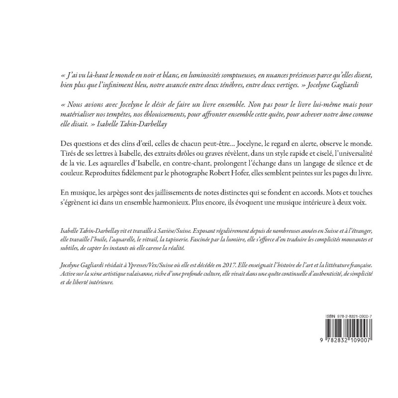 Des questions et des clins d’oeil, celles de chacun peut-être… Jocelyne, le regard en alerte, observe le monde. Tirés de ses ettres à Isabelle, des extraits drôles ou graves révèlent, dans n style rapide et ciselé, l’universalité de la vie. Les aquarelles ’Isabelle, en contre-chant, prolongent l’échange dans un angage de silence et de couleur. Reproduites fidèlement par le hotographe Robert Hofer, elles semblent peintes sur les pages du livre.