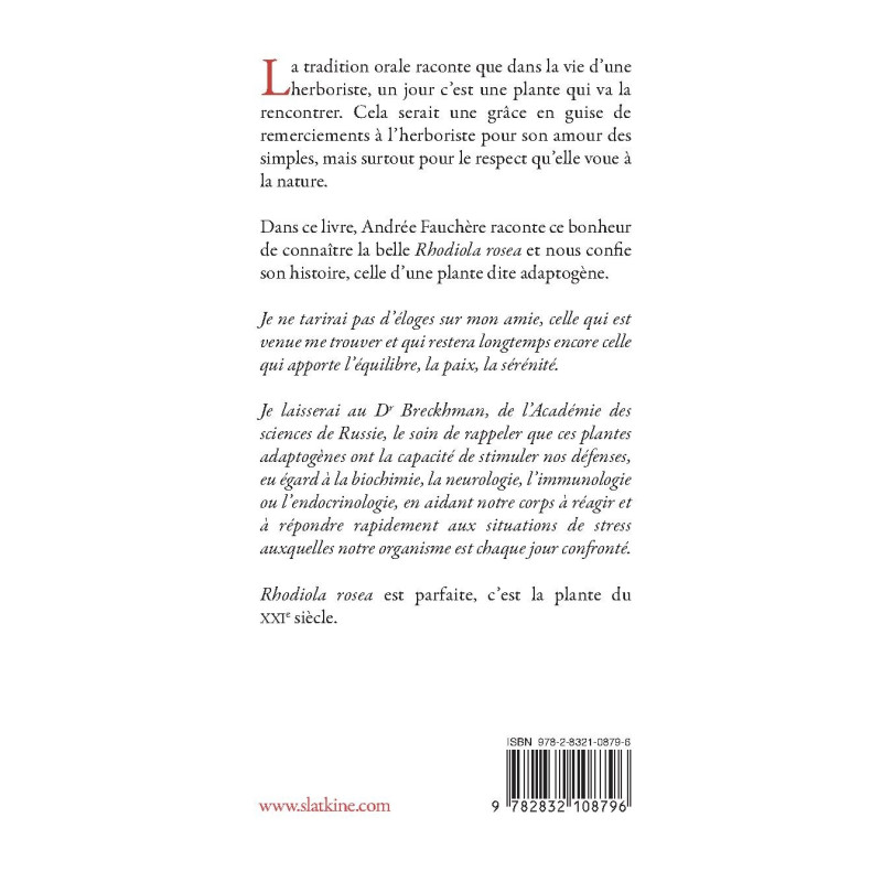 Dans ce livre, Andrée Fauchère raconte ce bonheur de connaître la belle Rhodiola rosea et nous confie son histoire, celle d’une plante dite adaptogène.