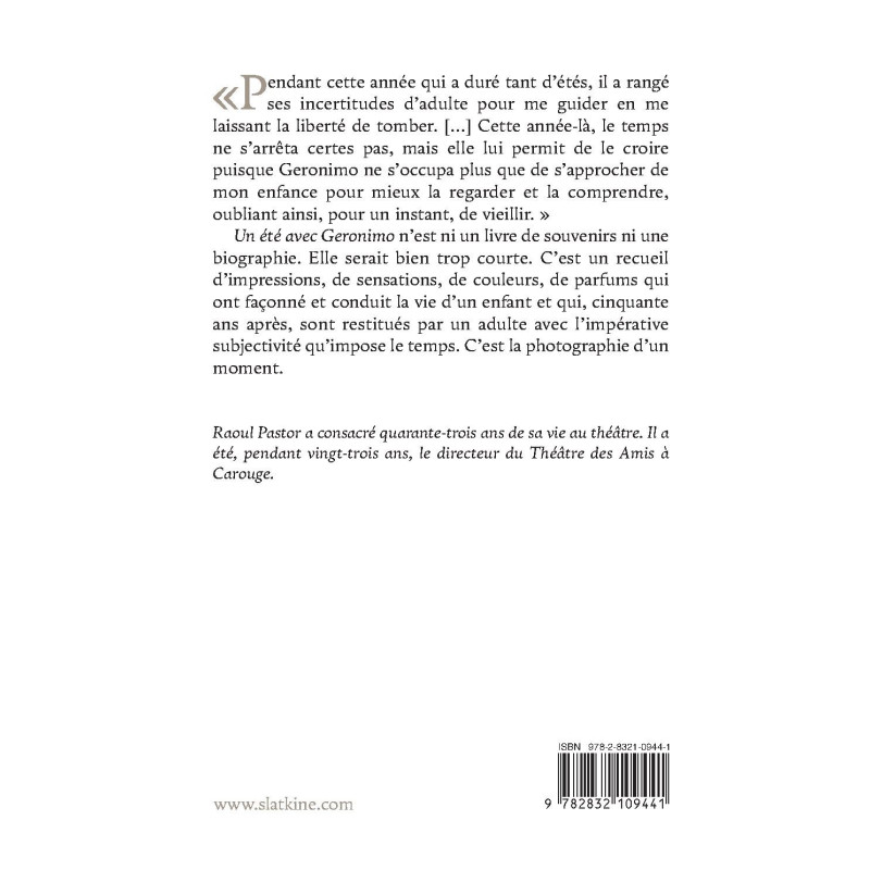 Un été avec Geronimo n’est ni un livre de souvenirs ni une biographie. Elle serait bien trop courte. C’est un recueil d’impressions, de sensations, de couleurs, de parfums qui ont façonné et conduit la vie d’un enfant et qui, cinquante ans après, sont restitués par un adulte avec l’impérative subjectivité qu’impose le temps. C’est la photographie d’un moment.