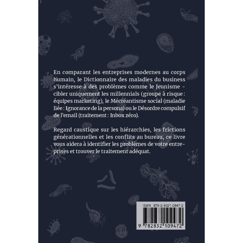 En comparant les entreprises modernes au corps humain, le Dictionnaire des maladies du business s’intéresse à des problèmes comme le Jeunisme - cibler uniquement les millennials (groupe à risque : équipes marketing), le Mécréantisme social (maladie liée : Ignorance de la persona) ou le Désordre compulsif de l’email (traitement : Inbox zéro).