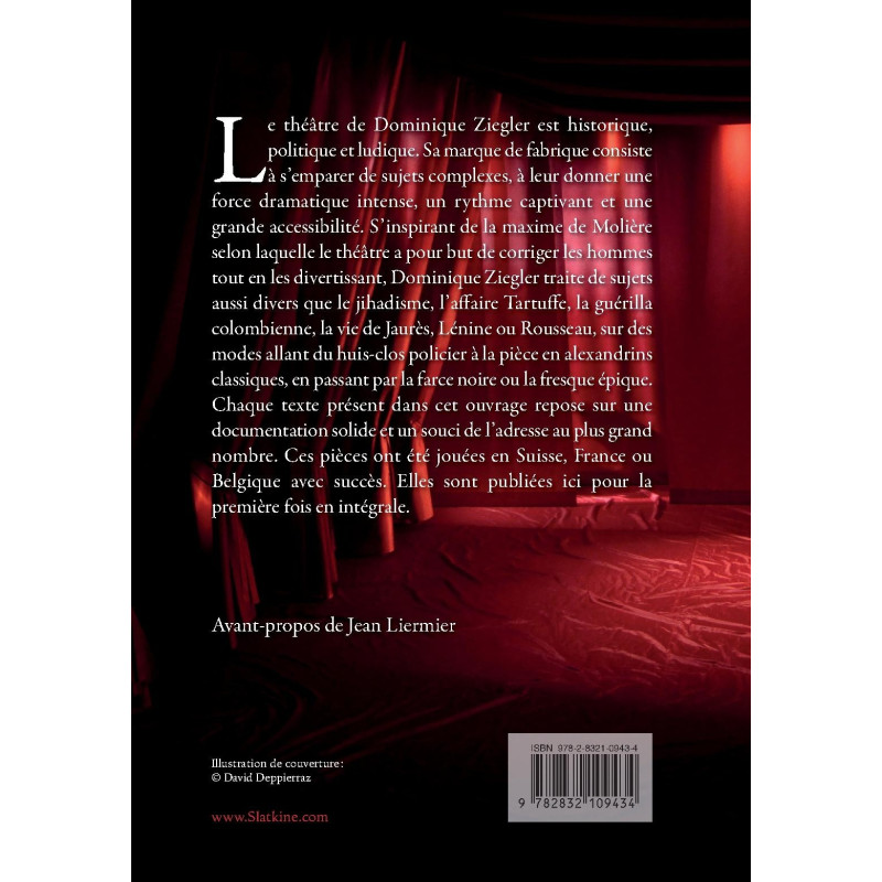 Le théâtre de Dominique Ziegler est historique, politique et ludique. Sa marque de fabrique consiste à s’emparer de sujets complexes, à leur donner une force dramatique intense, un rythme captivant et une grande accessibilité. S’inspirant de la maxime de Molière selon laquelle le théâtre a pour but de corriger les hommes tout en les divertissant, Dominique Ziegler traite de sujets aussi divers que le jihadisme, l’affaire Tartuffe, la guérilla colombienne, la vie de Jaurès, Lénine ou Rousseau, sur des modes allant du huis-clos policier à la pièce en alexandrins classiques, en passant par la farce noire ou la fresque épique. Chaque texte présent dans cet ouvrage repose sur une documentation solide et un souci de l’adresse au plus grand nombre. Ces pièces ont été jouées en Suisse, France ou Belgique avec succès. Elles sont publiées ici pour la première fois en intégrale.