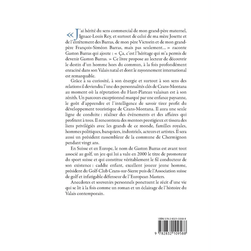Grâce à sa curiosité, à son énergie et surtout à son sens des relations il deviendra l’une des personnalités clés de Crans-Montana au moment où la réputation du Haut-Plateau valaisan est à son zénith. Un parcours exceptionnel marqué par une enfance paysanne, le goût d’apprendre et l’intelligence de savoir tirer profit du développement touristique de Crans-Montana. Il aura une seule ligne de conduite : réaliser des événements et des affaires qui profitent à tous. Il rencontrera des mentors prestigieux et tissera des liens privilégiés avec les grands de ce monde, familles royales, hommes politiques, banquiers, industriels, acteurs et artistes. Il sera aussi un président rassembleur de la commune de Chermignon pendant vingt ans.