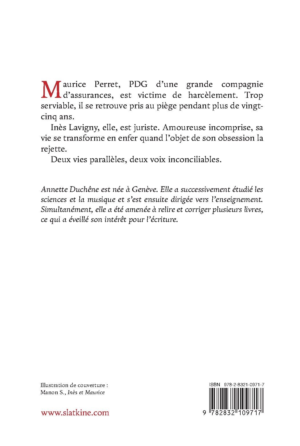Inès Lavigny, elle, est juriste. Amoureuse incomprise, sa vie se transforme en enfer quand l’objet de son obsession la rejette.